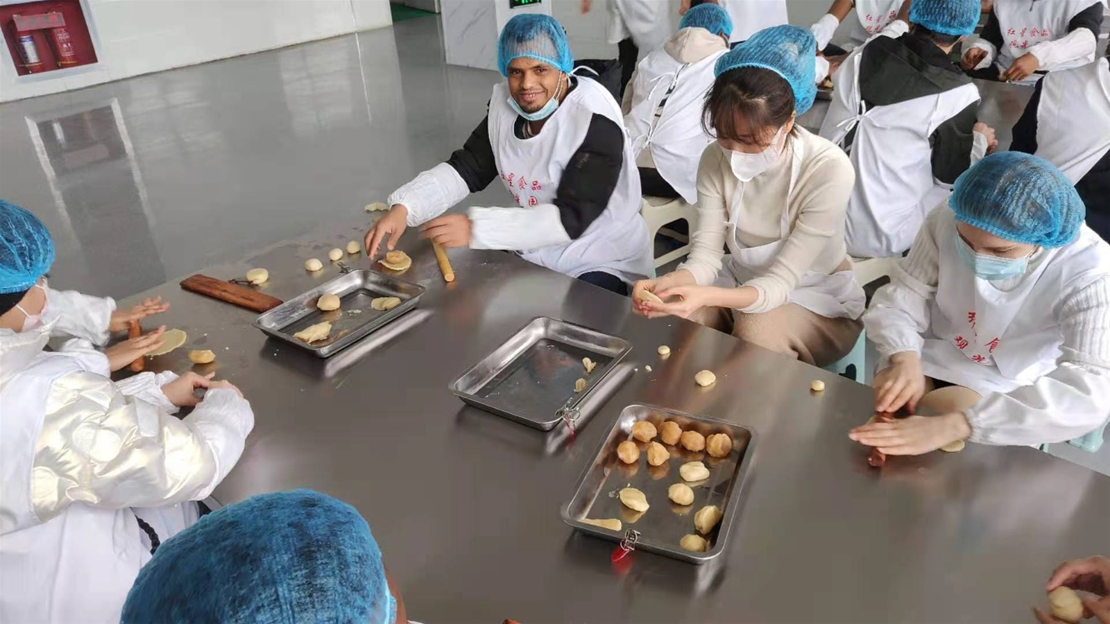 留学生们首先参观了红星软香酥集团同人志展厅,了解了企业发展历史及中国文化展示。随后来到该公司无菌车间食品生产流水线,听取了讲解员对公司生产流程、制造工艺、质量控制等情况的详细介绍。公司高端智能现代化生产线、整洁有序安全卫生的生产环境给大家留下了深刻印象。随后,留学生们穿上白色无菌服,前往DIY工坊亲手制作软香酥月饼,现场体验手工烘焙的乐趣。