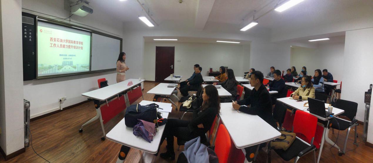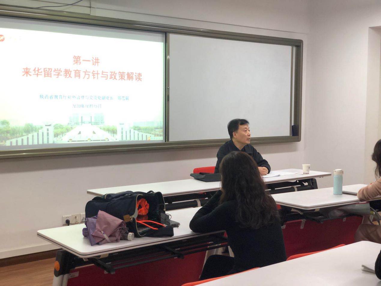 工作人员能力提升培训在在明德校区培训中心举办。根据培训计划,培训第一期邀请了陕西省教育厅对外合作与交流处副处长郭宏毅作来华留学教育方针与政策的专题讲座,董皓院长在开班仪式上致辞,副院长颜庭星主持。
