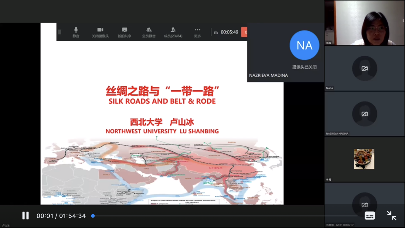 卢山冰教授做了题为“丝绸之路与‘一带一路’”的专题讲座,讲座详细介绍了“一带一路”倡议的内涵和外延,总结了倡议提出以来我国与沿线国家在政策、设施、经贸、金融、人文等方面的共建成果,及其带来的合作共赢局面。
