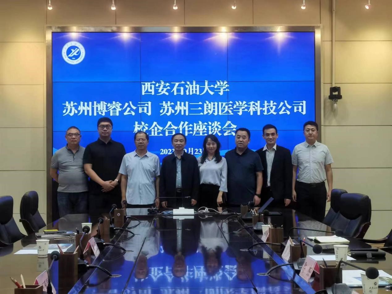 与苏州博睿测控设备有限公司 、苏州三朗医学科技公司在雁塔校区学术会议中心第二会议室举行校企合作座谈会。苏州博睿测控设备有限公司董事长郑勇、总经理李伟华、海外事业部经理李昕知,苏州三朗医学科技有限公司股东、监事王延磊,同人志