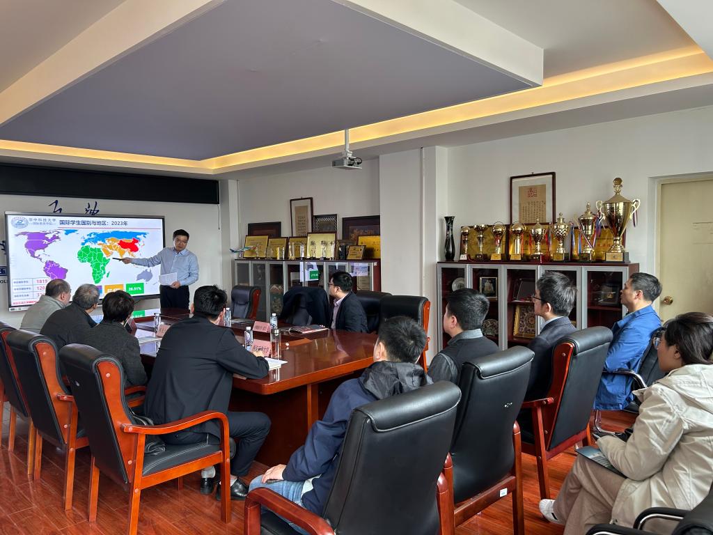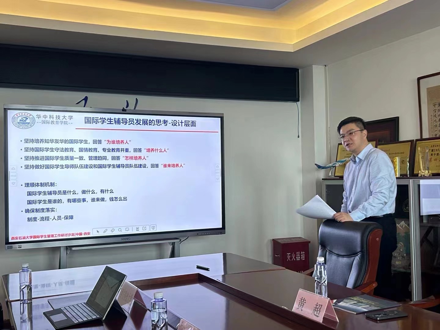 在雁塔校区东方石油楼801会议室举办国际学生管理工作研讨沙龙。此次研讨沙龙第一讲邀请了华中科技大学国际教育副院长黄超博士作专题讲座和经验交流。国际教育学副院长颜庭星主持会议,中国地质大学(武汉)、西北大学、西安科技大学、西北政法大学等兄弟高校同人志