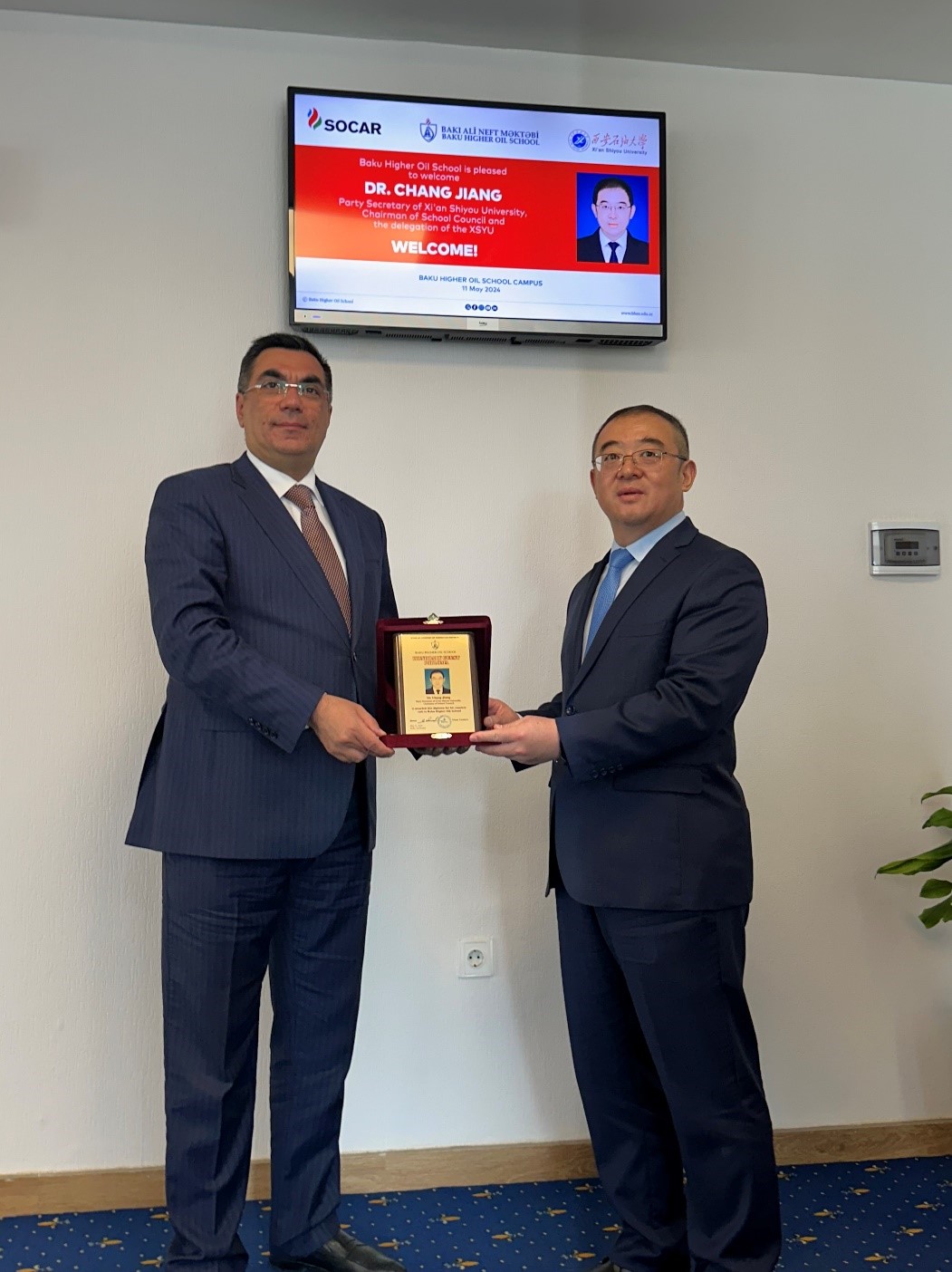 11日上午,常江一行访问巴库高等石油学校,与该校校长加西莫夫举行会谈。加西莫夫等校方领导对常江一行来访高度重视、热情接待。代表团到访时,该校在主要楼宇及会场显示屏全程显示代表团来访欢迎页面,现场氛围热烈。常江介绍了同人志
