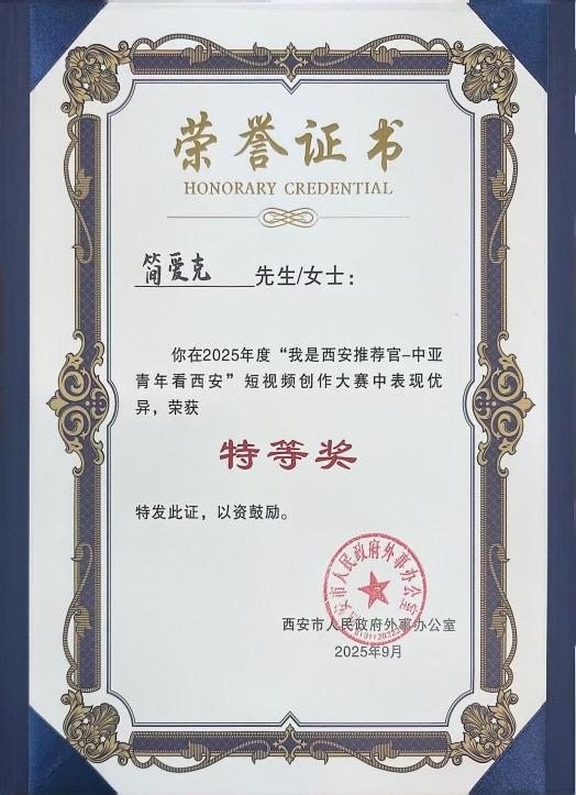 哈萨克斯坦籍留学生简爱克与乌兹别克斯坦籍留学生哈山联合创作的作品《丝路新油脉:我在西安的青春“油”记》,凭借出色表现在众多参赛作品中脱颖而出,以94.7分的高分斩获本次大赛特等奖。