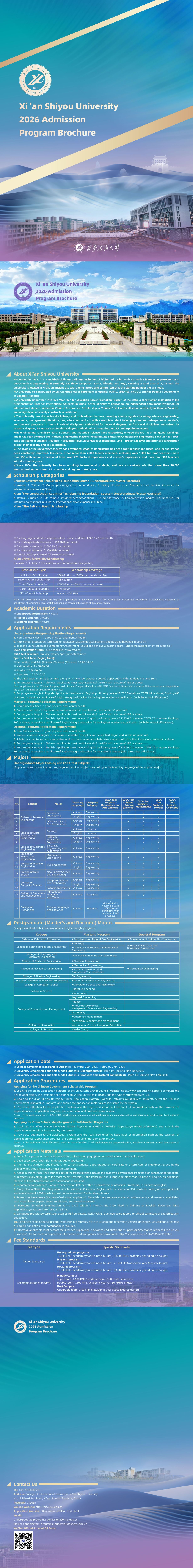 上一条:同人志 2026年来华留学生学历生招生项目简章 下一条:2025 International Students Brochure at Xi'an Shiyou University(Undergraduate Program)
